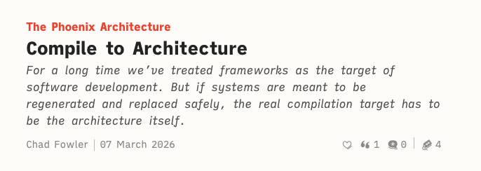 For a long time we’ve treated frameworks as the target of software development. But if systems are meant to be regenerated and replaced safely, the real compilation target has to be the architecture itself.